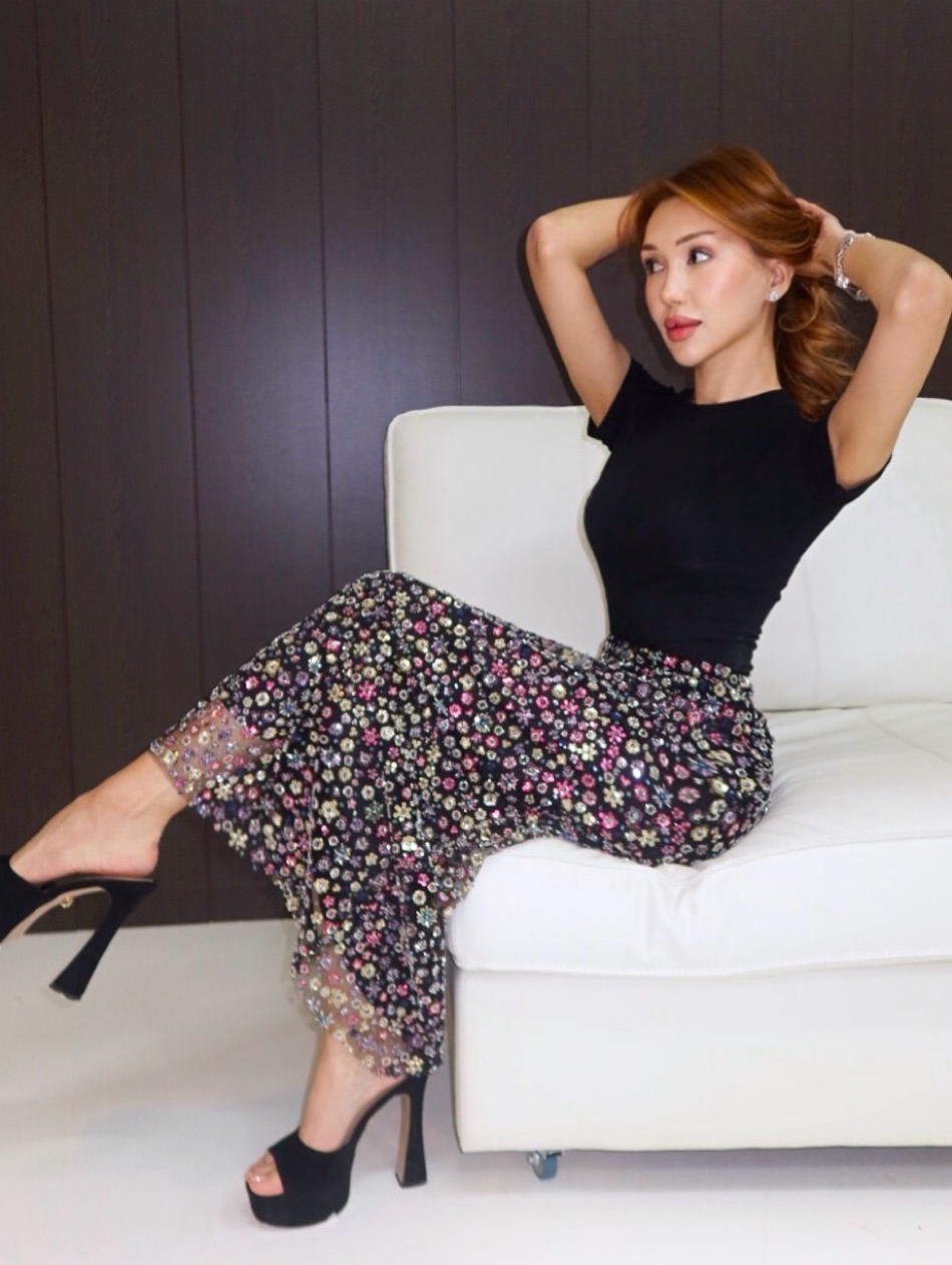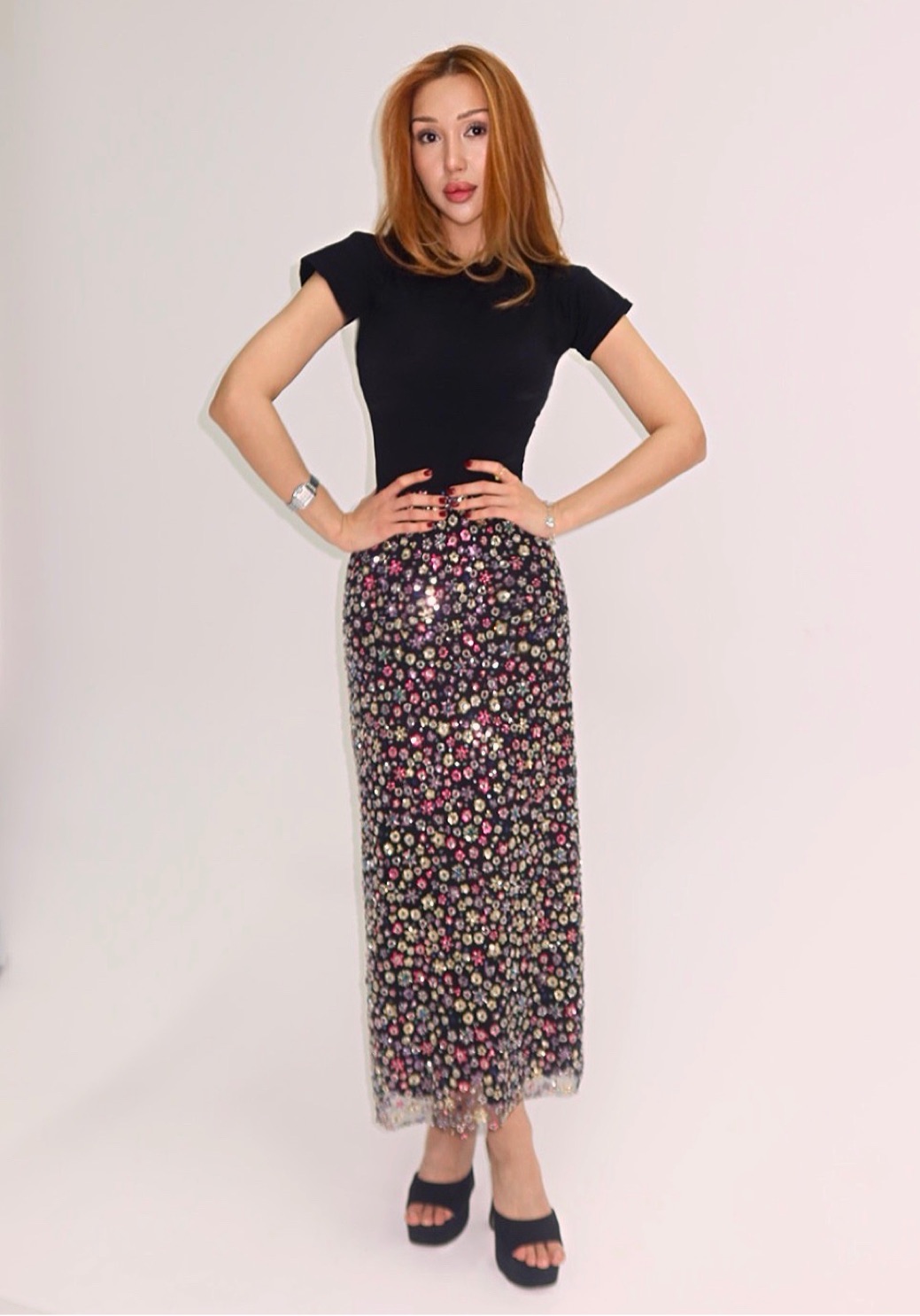 Рассыпная вышивка на прямом миди-силуэте создаёт образ тихой, осознанной элегантности. Для тех, кто находит красоту в деталях.